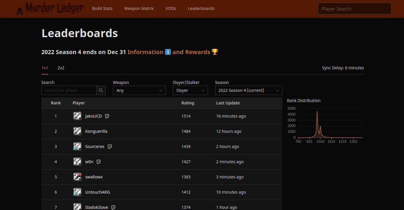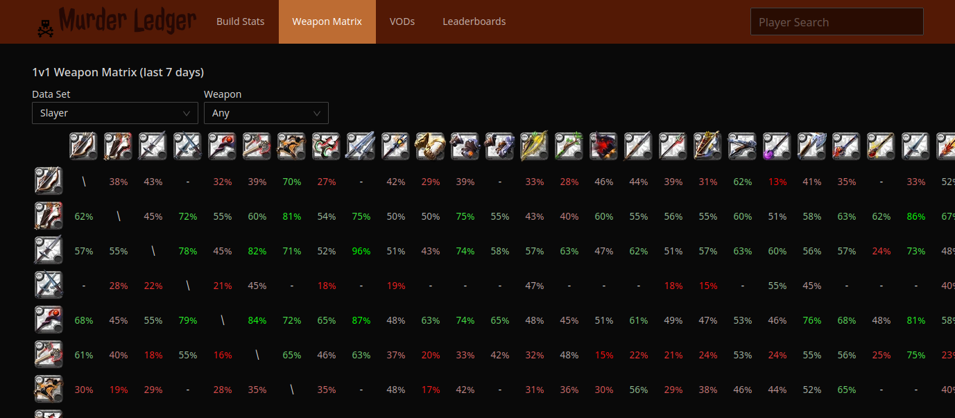 One of the most valuable features of murderledger turned out to be integration with twith.tv. On a whim, I decided to look into using the twitch API to see if we could essentially get clips of recent fights which were live streamed. The process involves manually linking a streamers twitch channel to their Albion player name. Then when we see an event for a player that has a linked twitch channel, we use the twitch API to check if they are live. If they are, and they have VODs enabled, then we can generate a link to the twitch video with a timestamp offset to right around the time the kill happened. This feature was a game changer. Murderledger lets players find videos of specific weapon matchups to see how other people play and how they can improve. It also helps content creators easily find the timestamps of specific fights in their VODs.